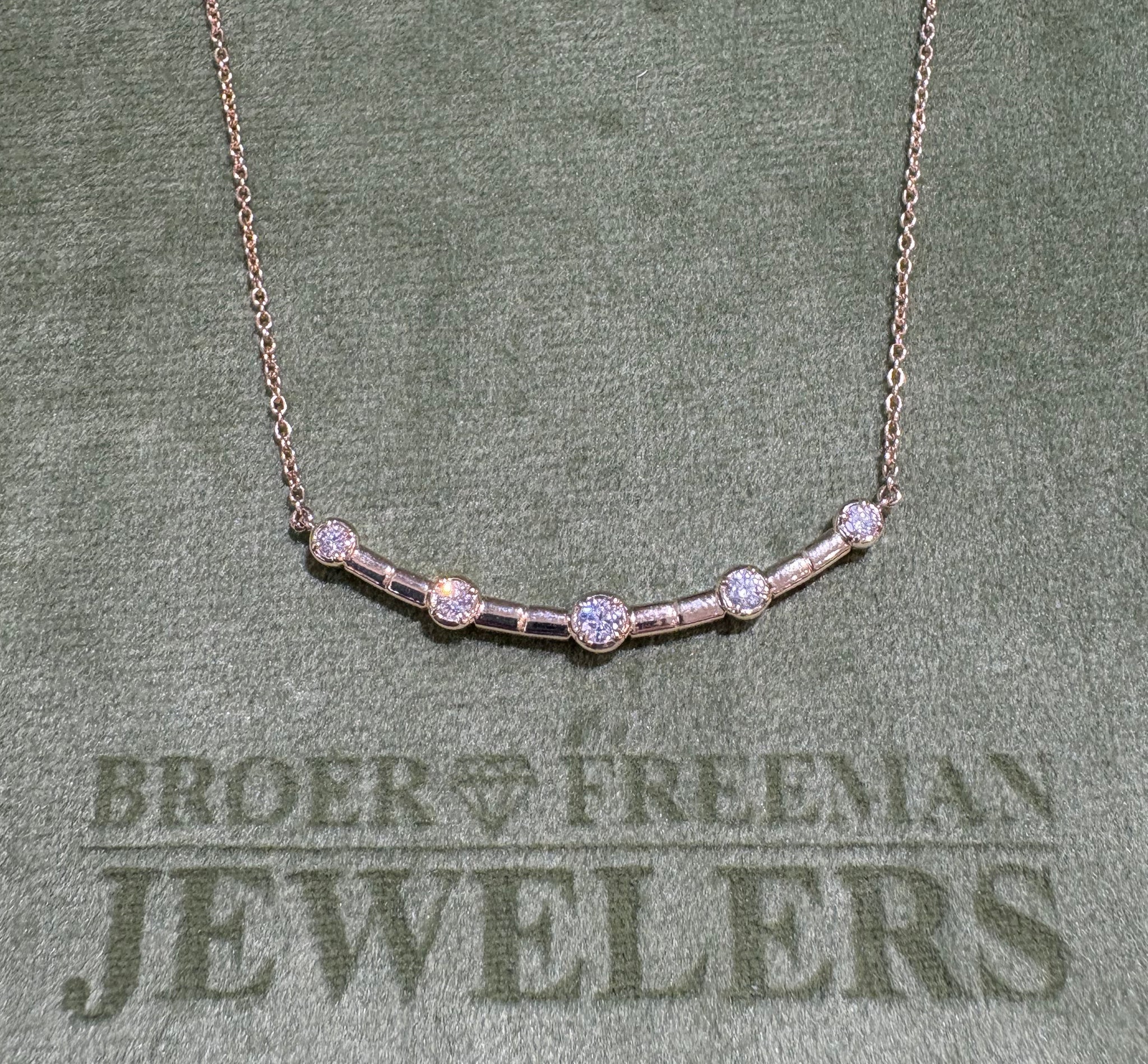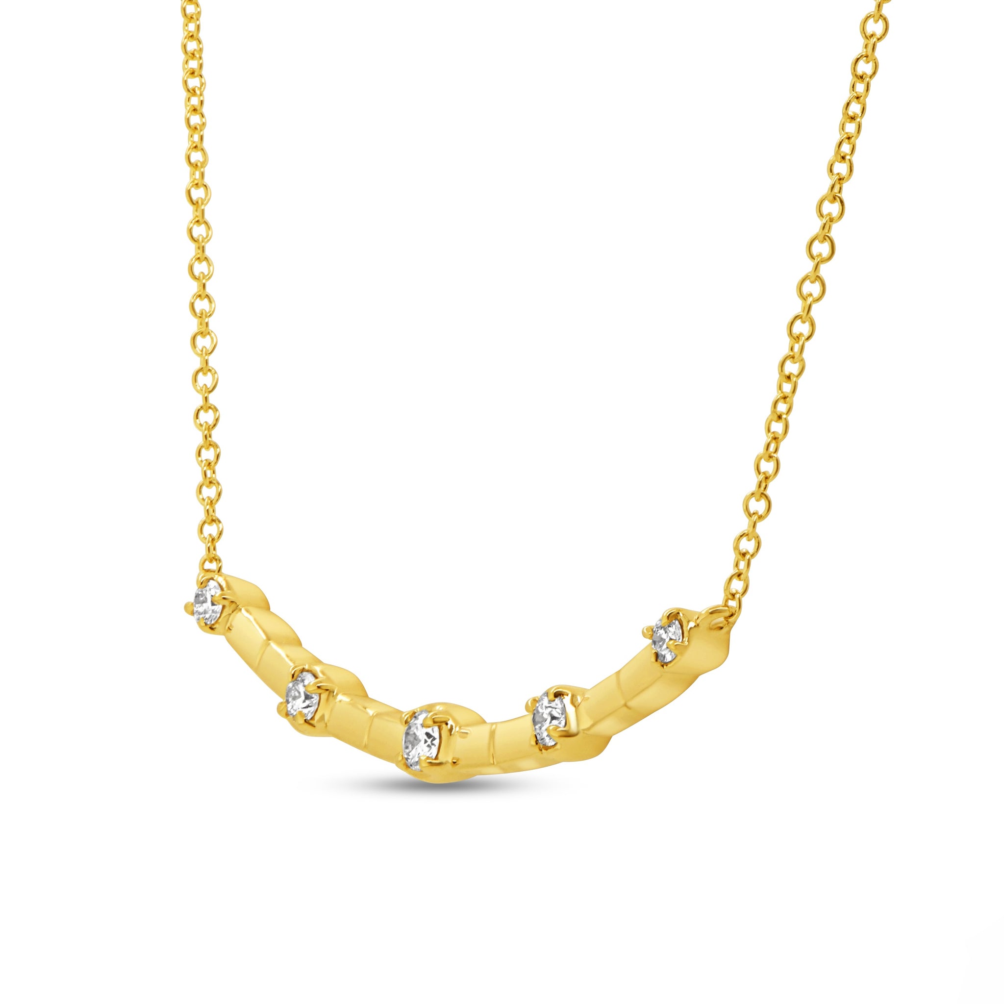 Embrace your inner sparkle with this delightful curved bar necklace, crafted in 14k yellow gold and studded with 0.23 carats of brilliant diamonds. The curved silhouette adds a cheeky twist to classic elegance, making it the ultimate go-to piece for a smiley moment. Wear it bold, wear it layered, or wear it your way—this necklace is happy to tag along on your next adventure.