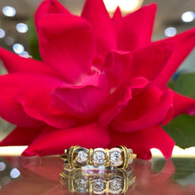 What better combination than platinum, 18k yellow gold and diamond! A classic 3 stone design with gorgeous detail around the diamonds. This can be worn as a wedding band, anniversary ring or stackable ring. The options are endless! The low profile design is ideal for the one who is tough on jewelry.