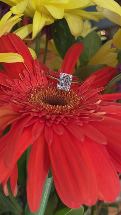 This lovely ring is set with natural baguette and round diamonds expertly set to mirror a beautiful emerald cut diamond. Sparkly from every angle, unique but classic. This solitaire diamond ring can be worn as an engagement ring or fabulous right hand ring!