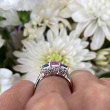 - Set with an Natural Emerald Cut Pink Sapphire weighing 1.48 carats