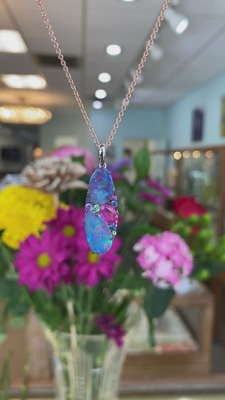 Look no further than this gorgeous necklace, featuring opals, sapphires, and garnets in an oval-shaped pendant set in a shining white gold with a contrasting rose gold chain. Graceful and elegant, this necklace will be a beautiful addition to any jewelry collection.